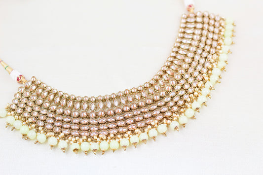 POLKI NECKLACE SET WITH LIGHT SAGE GREEN BEADS (4PC)