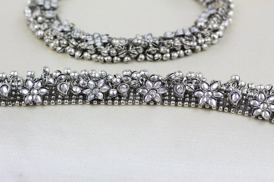 SILVER FINISH OXIDIZED KUNDAN FLOWER ANKLETS