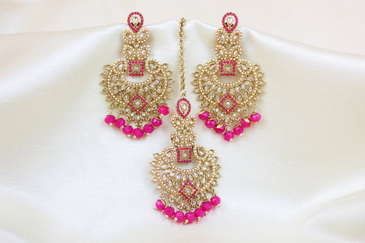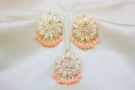 KUNDAN NECKLACE SET WITH PEACH BEADS (4PC)