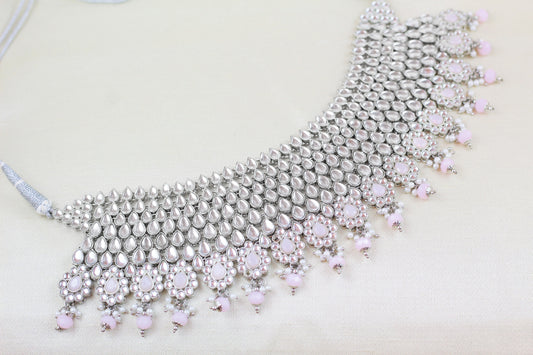 SILVER FINISH KUNDAN NECKLACE SET WITH BABY PINK BEADS (4PC)