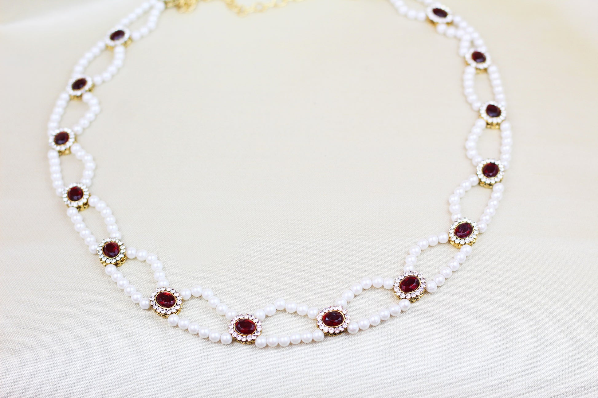DOUBLE PEARL CHAIN AND RED STONE WAIST BELT