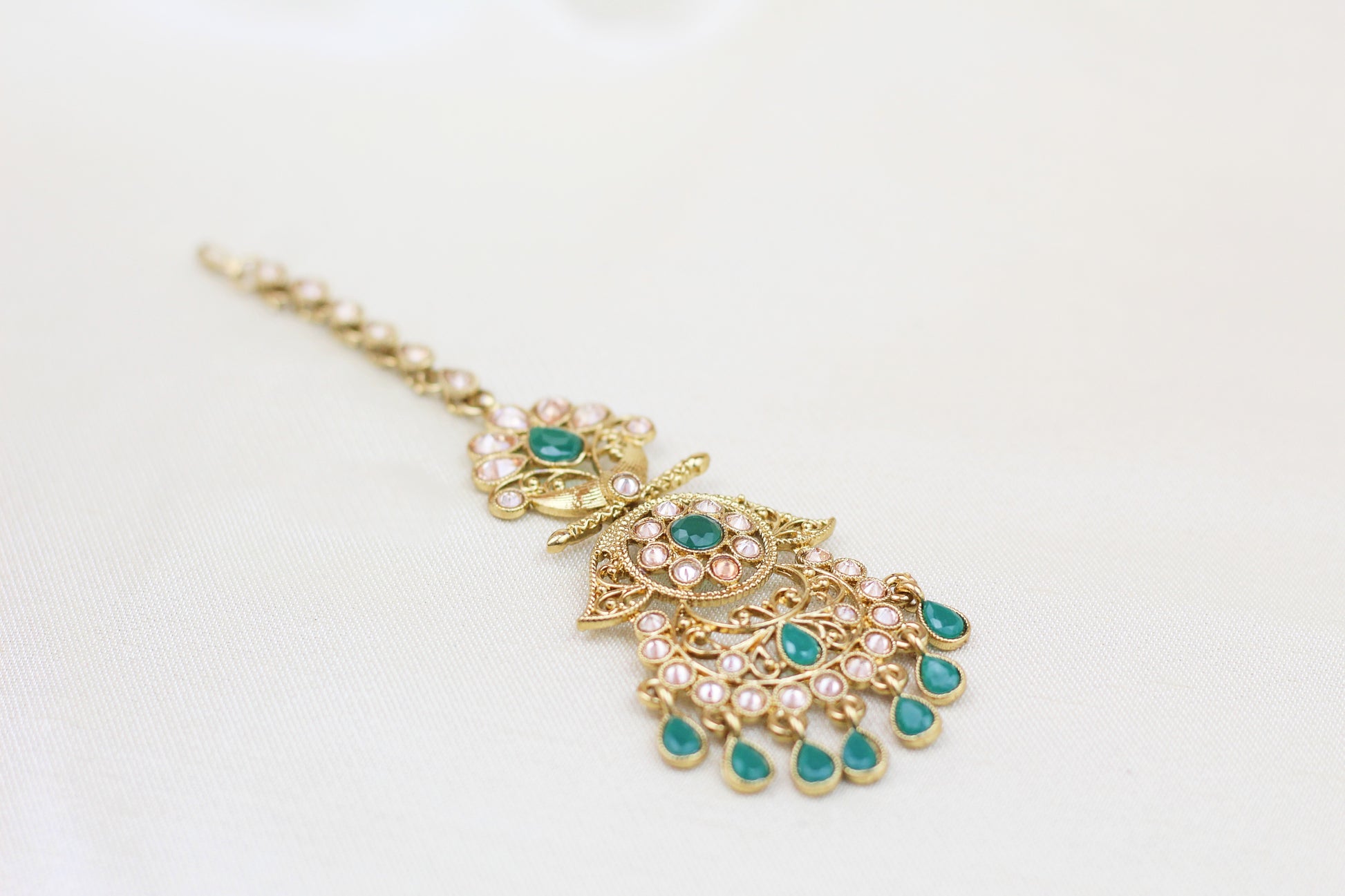 POLKI WITH GREEN BEADS MAANG TIKKA