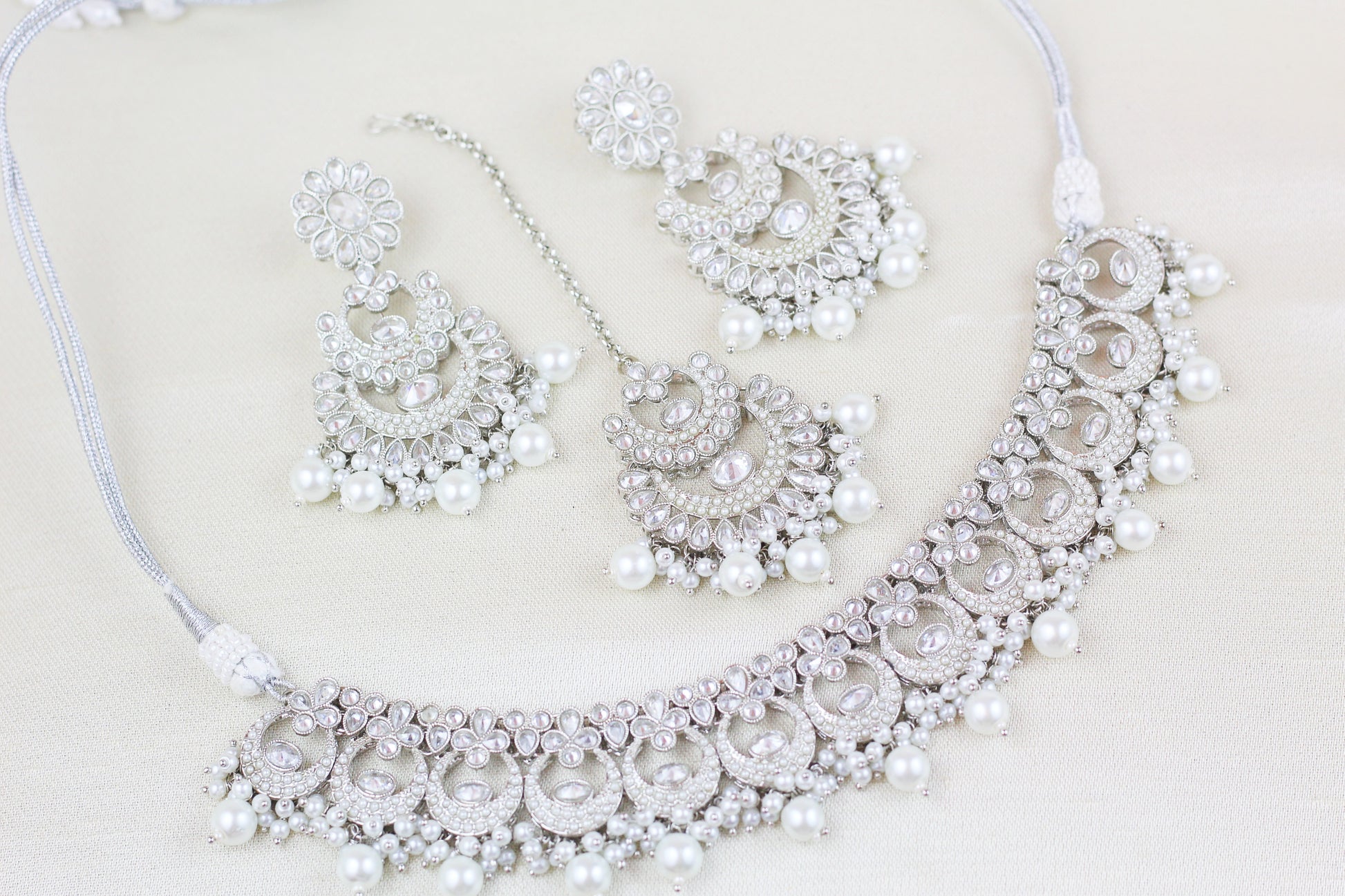SILVER FINISH POLKI AND PEARL NECKLACE SET (4PC)
