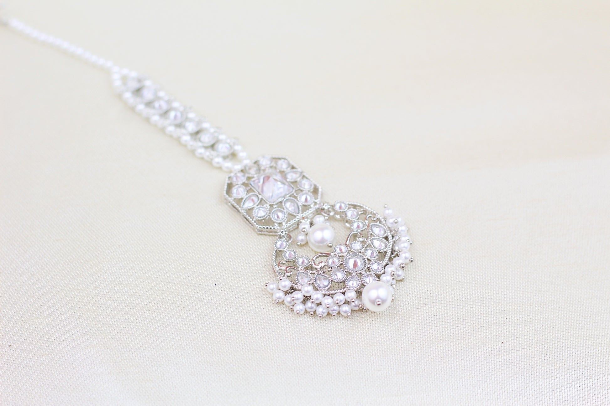 SILVER POLKI WITH PEARL DROP MAANG TIKKA
